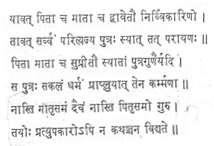 "Take your mother to be God; take your father to be God." Look again what Bhagwan Manu says(Manu- Samhita, II, 225-237): "Father is the image, the incarnation of Brahma the creator;Mother, that of Earth. One must not insult them even if they treat one shabbily; one ought to submit to every oppression at their hands. A son cannot even repay the debt he owes to his parents in a hundred years. It is his duty to please them by all means. To please them is to please all and to reap the harvest of all austerities. There cannot be a greater form of austerity or papaya than devoted service to parents. Without theirpermission, a son should not undertake any religious duty to serve mother is to be master of this world; to serve father is to be master of the next. So long as they live, no form of religion need be observed; only they should be attended to and such things ought to be done as may please them One’s entire duty ceases with service to father, mother and Guru. This is the supreme Dharma. Every other dharma is pseudo-dharma."