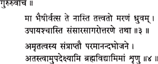 The Guru said: Fear not, my child; In reality there is no death for thee. There is a means of crossing this ocean of relative existence and attaining immortality or Supreme Bliss. I shall teach thee now Brahma-Vidya. Hear with rapt attention.