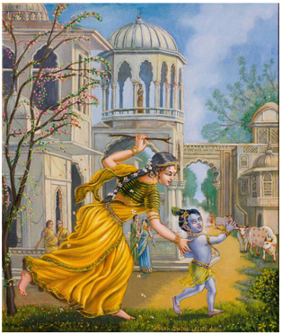 Painted By Dominique Amendola, this painting captures the joyful leela of Maa Yashoda pursuing mischievous Krishna who ultimately tied him with a rope. Kartika is Lord Krishna's most beloved month; minimal effort in this month yields great grace for sadhakas. The name Damodara ("Dam + Udara = rope on the belly") immortalizes the moment His mother's boundless love bound Him.